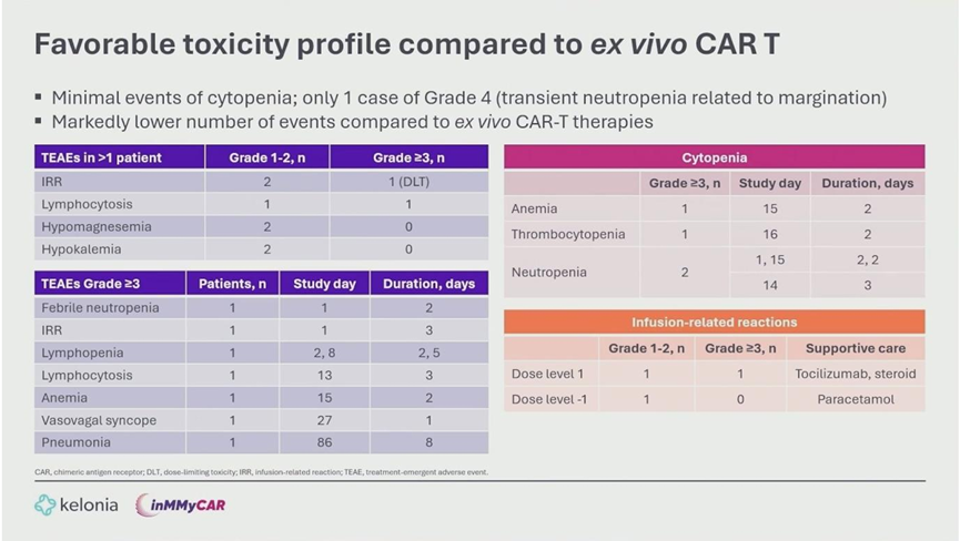 - Hematology: Unlike ex vivo CAR-T, there were no prolonged high-grade cytopenias. One transient Grade 4 neutropenia resolved within 16 hours.