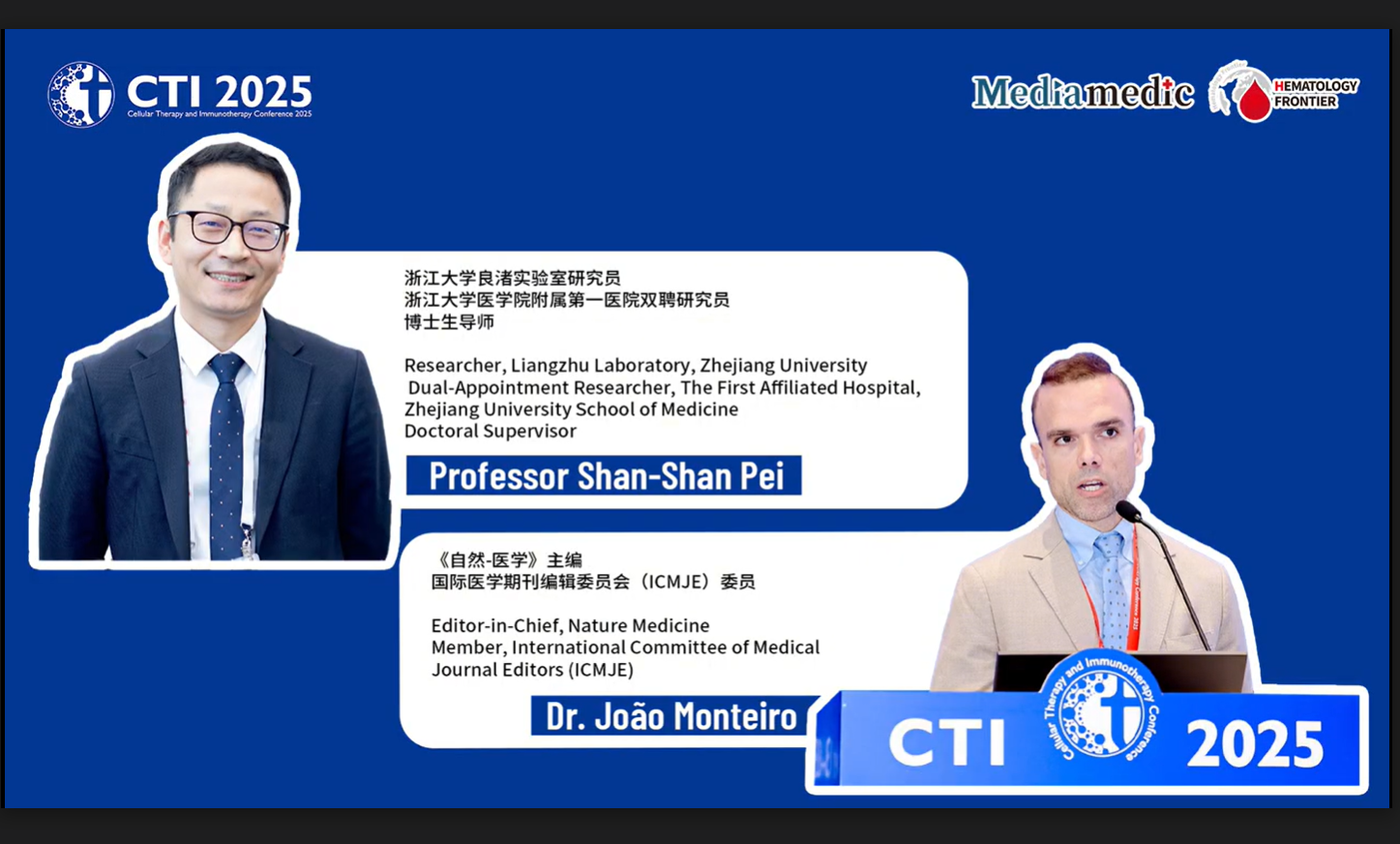 In today’s rapidly evolving biomedical landscape, cell therapy has emerged as a major breakthrough direction and a focal point of global scientific inquiry. Against this backdrop, during the 2025 International Cell and Immunotherapy Congress (CTI 2025), Professor Shanshan Pei of Liangzhu Laboratory and the First Affiliated Hospital of Zhejiang University School of Medicine engaged in a scholarly dialogue with Dr. João Monteiro, Editor-in-Chief of Nature Medicine.