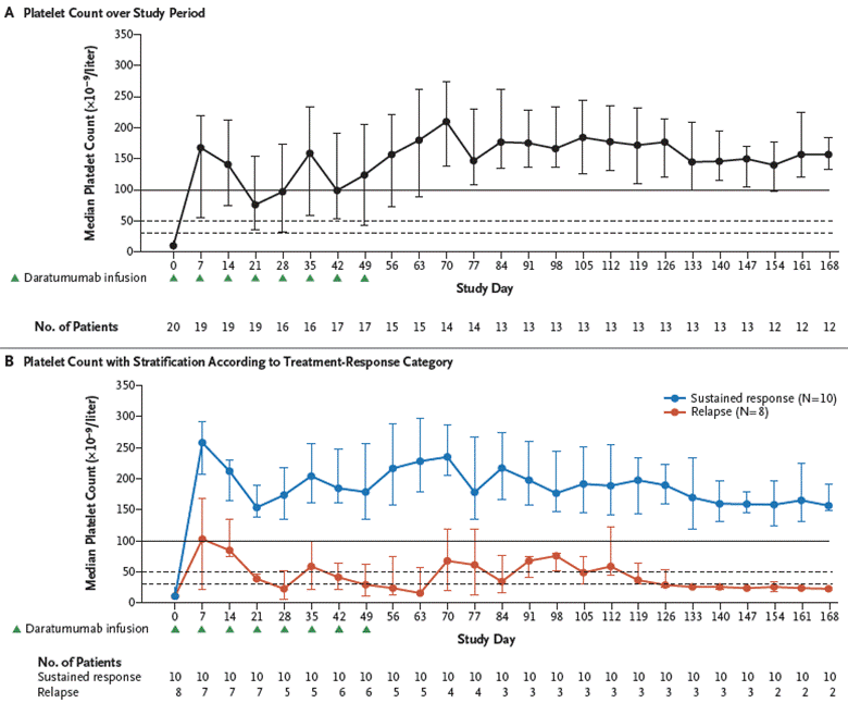 This open-label, single-arm Phase 2 clinical trial enrolled 20 pediatric patients with persistent or chronic ITP who had previously failed guideline-recommended first-line corticosteroid therapy (due to lack of efficacy, inability to maintain response, or relapse) and at least one prior second-line therapy. Patients received daratumumab at a dose of 16 mg/kg once weekly for eight weeks. The primary objective was to evaluate the safety and efficacy of daratumumab in children with relapsed/refractory ITP.